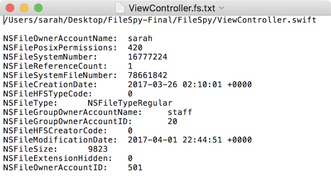 FileManager类,如propertyhomeDirectoryForCurrentUser,applicationSupportDirectory,甚至attributesOfItem,它包含了一个文件或目录的详细信息。 - 你学到了如何保持一个文件的相关信息。