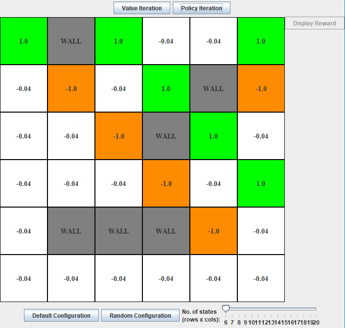 Each of the non-wall squares is defined as a non-terminal state. Green, Brown, White squares has a reward value of 1, -1, -0.04 respectively.
