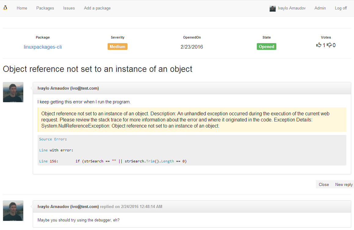 - The home page displays the recently posted issues, recently uploaded packages, recently added package comments and issue replies