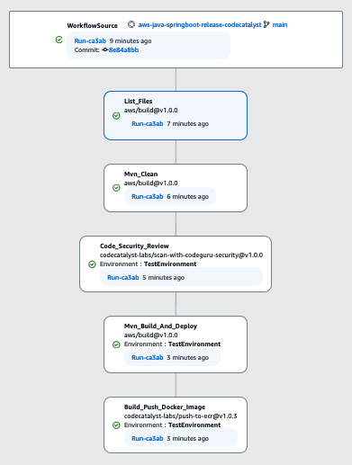 .codecatalyst/workloadsfolder, the definition of two CodeCatalyst workflows:build.yaml: the workflow builds the jar, performs a CodeGuru Security review, uploads it to CodeArtifact, builds the Docker images, uploads it to ECRtest.yaml: the workflow perform unit and coverage tests on code