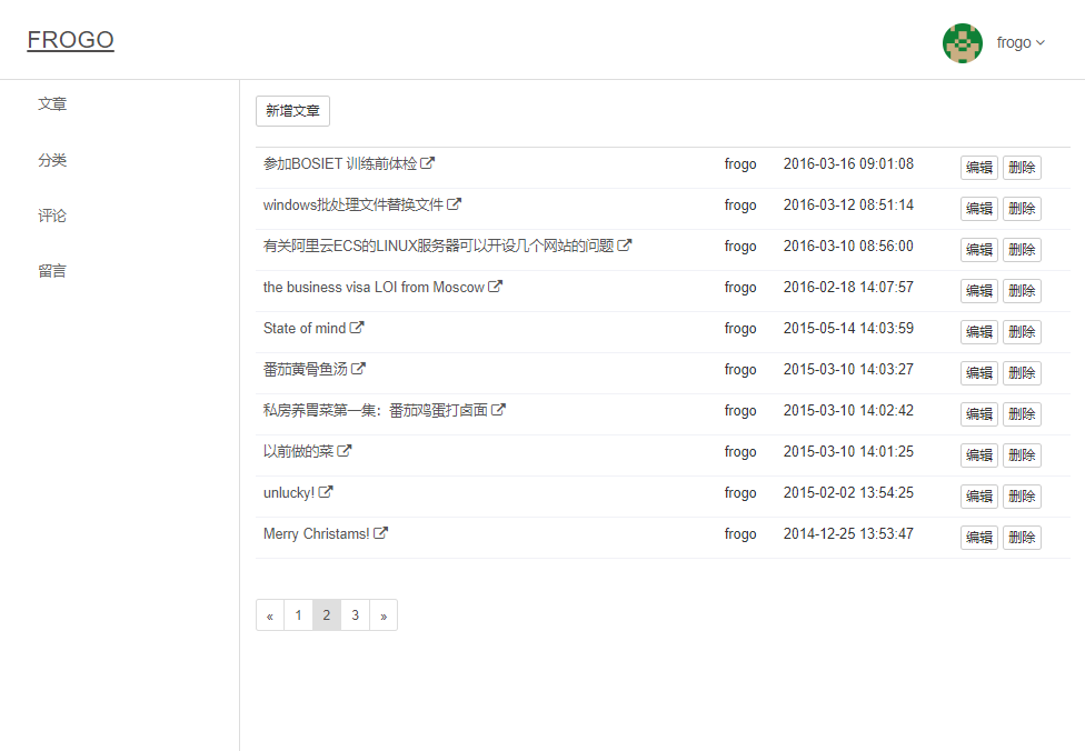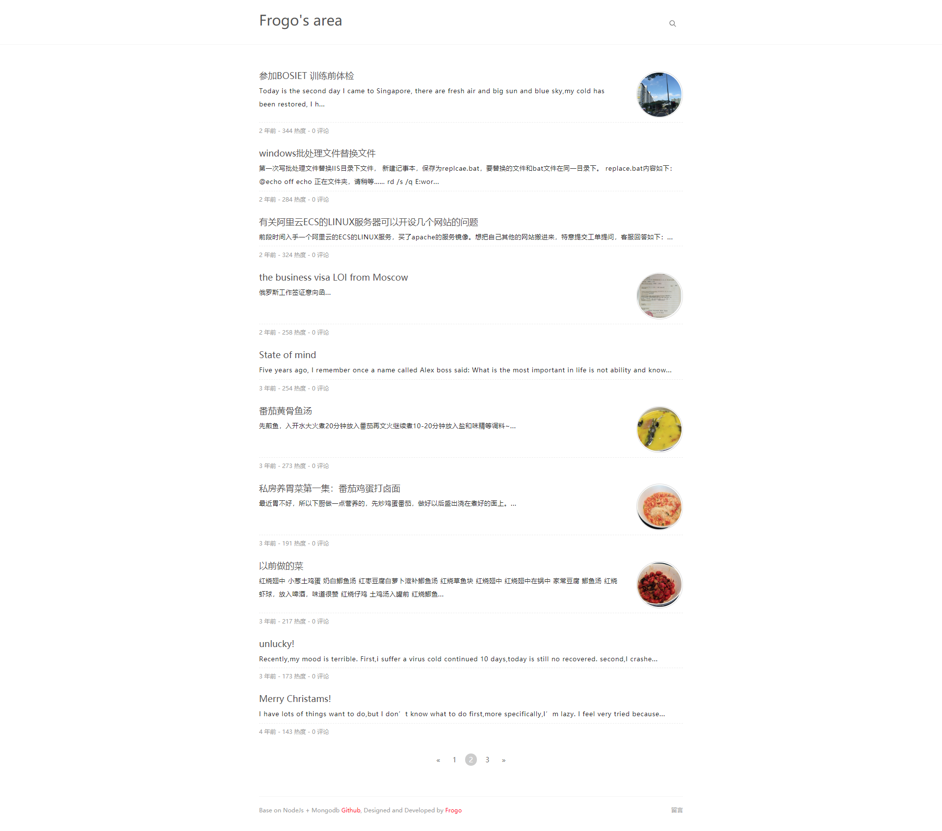 个人博客blog.frogo.cn,该博客是部署在阿里云的centOS6.5上面,部署教程可参照 在阿里云ECS CentOS7上部署基于MongoDB+Node.js的博客