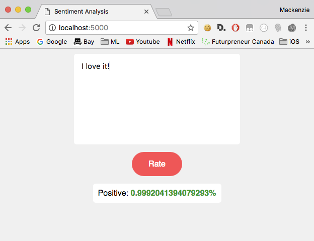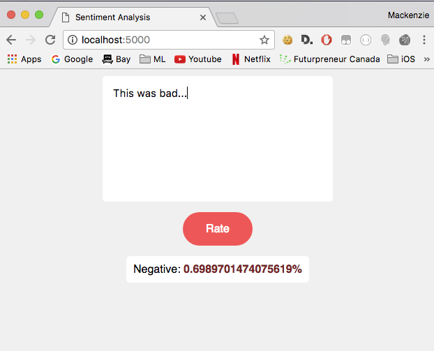 This was built by training a Bernoulli Naive Bayes classifer on a dataset of ~2k examples from movie reviews. I haven't tested the accuracy, as I know it's extremely low, although I believe if I preprocessed the data with word2vec to extract the proper features, I'd have a bit better results.
