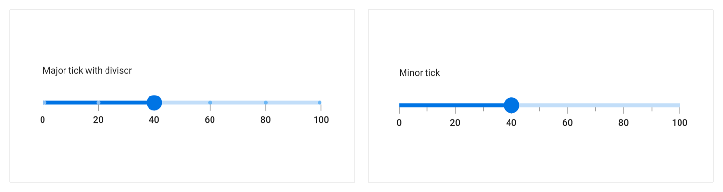 Ticks and dividers - Show ticks and dividers based on the interval. Also, enable minor ticks between the ticks to indicate the selected values. These options show the selected range in a more intuitive way for the end users.